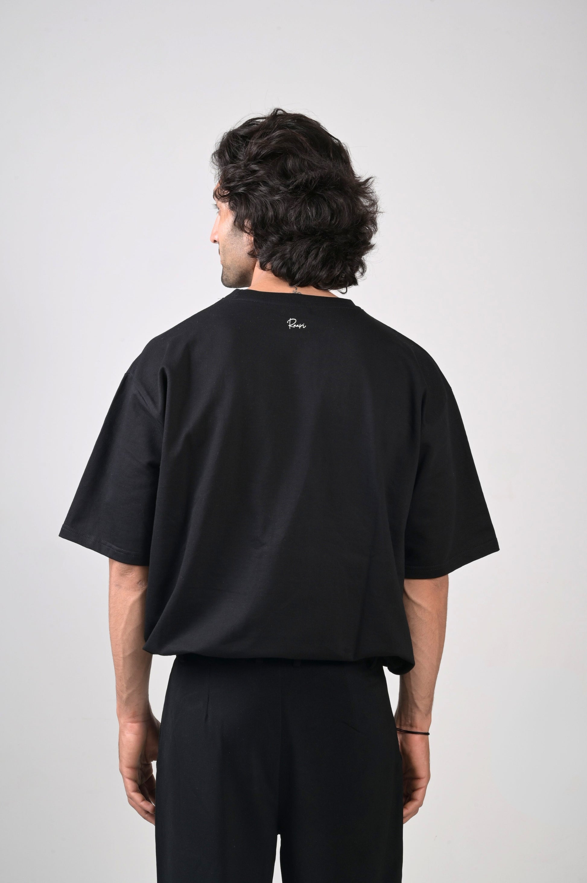The design is elegantly understated, featuring our distinctive Raari logo subtly printed on the upper back. This minimalist approach allows the quality of the fabric and the modern, relaxed fit to truly shine. The classic jet black hue ensures versatility, making it a perfect staple that seamlessly integrates into any outfit, for any occasion.