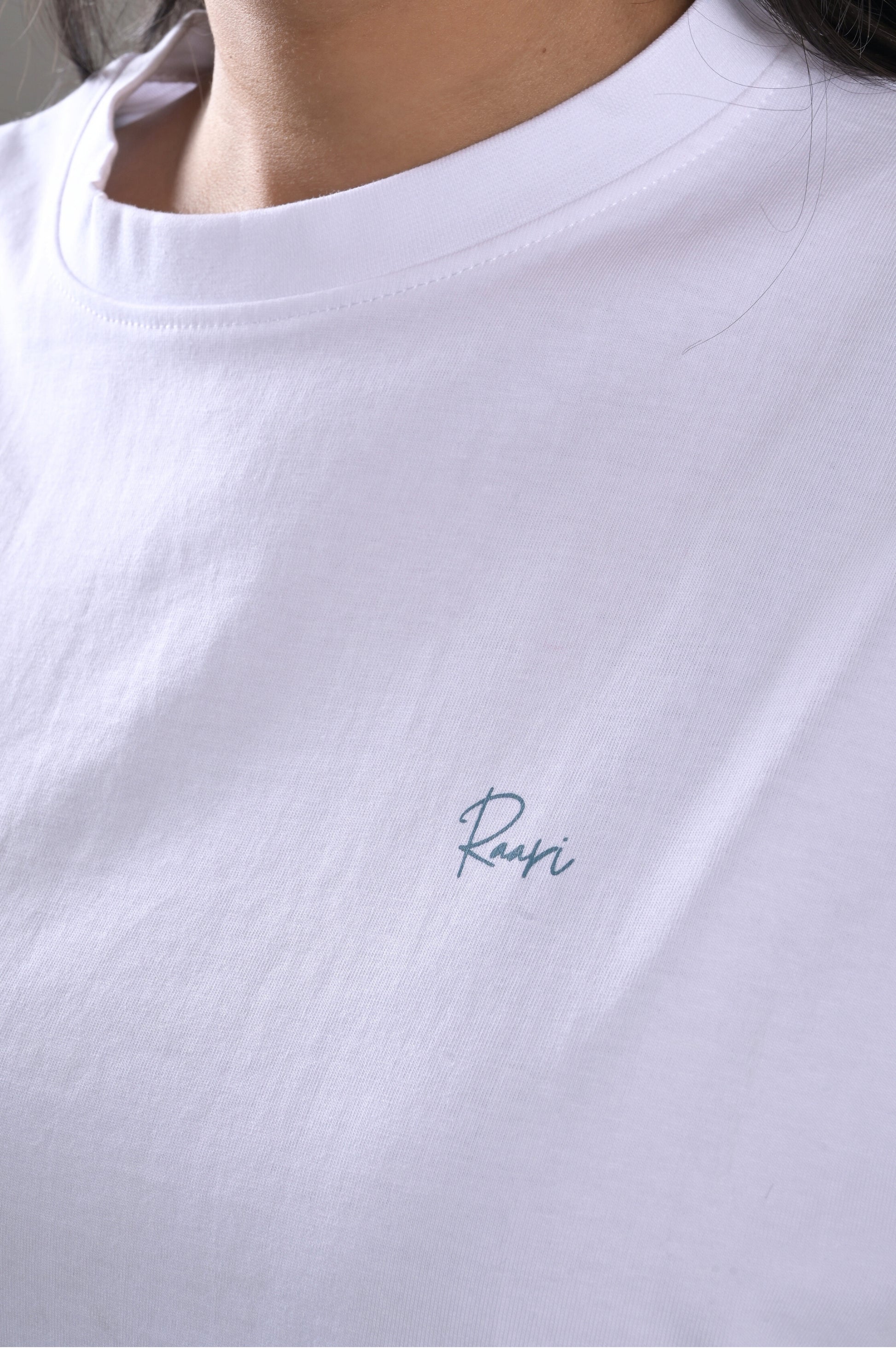 The design is elegantly understated, featuring our distinctive Raari script logo subtly printed on the side. This minimalist approach allows the quality of the fabric and the modern, relaxed fit to truly shine. The classic white ensures versatility, making it a perfect staple that seamlessly integrates into any outfit, for any occasion.
